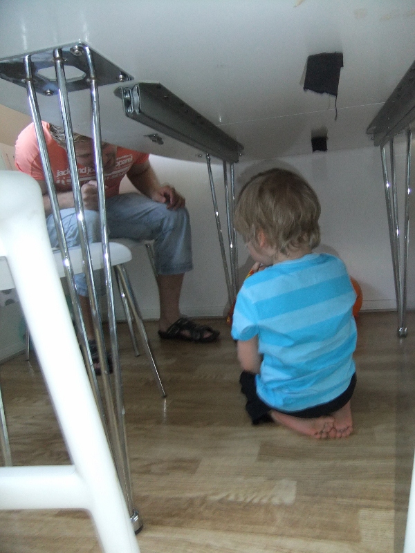 När vi började sjunga för honom så smet han snabbt som ögat o gömde sig under bordet... plutten!♥